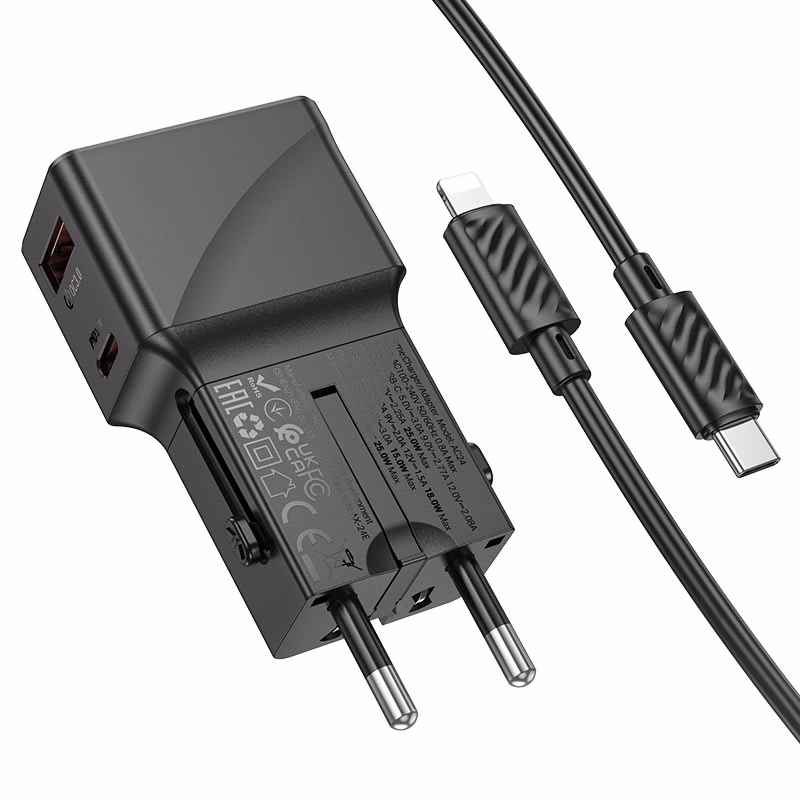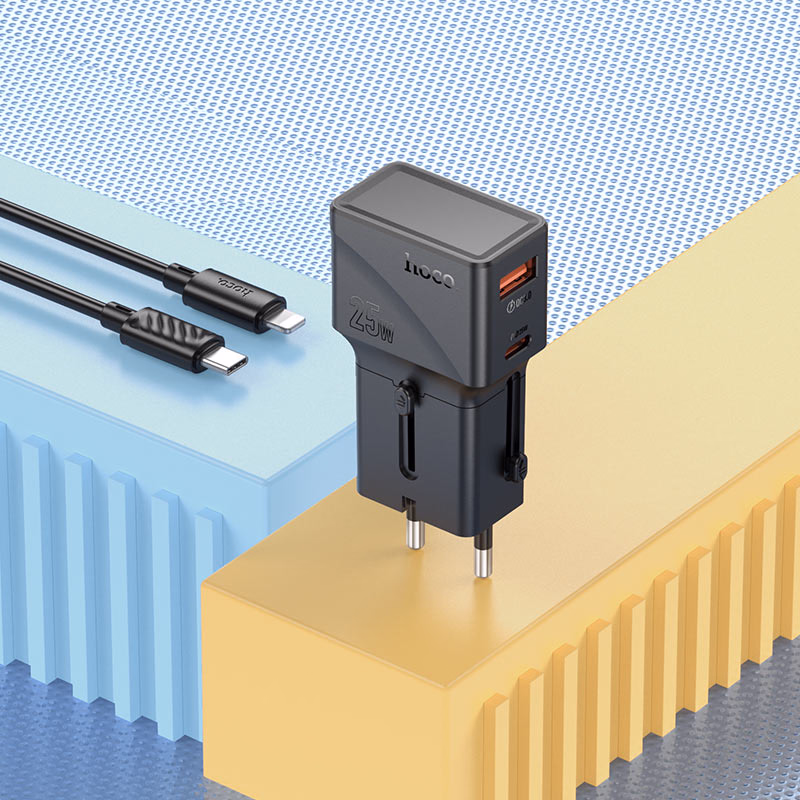 Le chargeur universel AC24 Mini offre une puissance de charge rapide et sûre, idéale pour tous vos appareils modernes. Il prend en entrée CA 100–240 V, 50/60 Hz, 0,8 A, et propose deux sorties : 1 port USB-A (5 V/3 A, 9 V/2 A, 12 V/1,5 A – 18 W max) et 1 port Type-C (5 V/3 A, 9 V/2,77 A, 12 V/2,08 A – 25 W max), avec la technologie PPS jusqu’à 25 W. En utilisation simultanée, la puissance totale atteint 15 W max (5 V/3 A). Compatible avec les principaux protocoles de charge rapide – PD3.0, PD25W, PPS, QC3.0, AFC, FCP et plus – il assure une charge optimale pour smartphones, tablettes et autres appareils. Ses prises convertibles UE/US/UK/AU le rendent parfait pour les voyages internationaux, tandis que son boîtier en PC ignifugé garantit une sécurité maximale. Livré avec un câble USB-C vers USB-C ou USB-C vers iPhone de 1 m, le AC24 Mini combine performance, fiabilité et portabilité dans un design compact de 70 × 42 × 25 mm pour seulement 65 g (ou 79 g avec le câble).