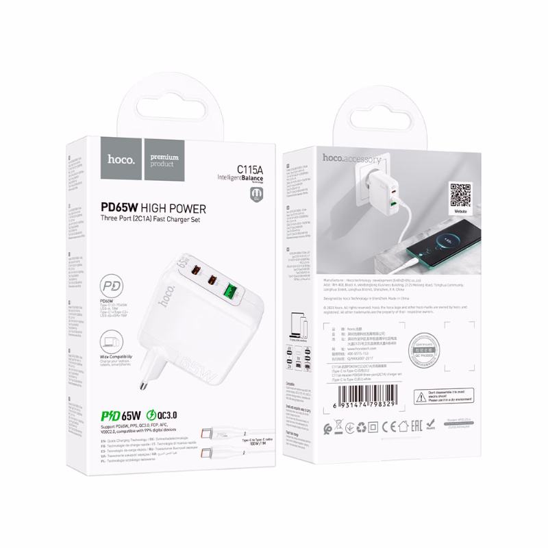 Équipé de deux ports Type-C et d’un port USB-A, le Hoco C115A offre une sortie totale jusqu’à 65W, capable d’alimenter simultanément plusieurs appareils : MacBook, iPhone, Samsung Galaxy, Xiaomi, ou encore tablettes et écouteurs sans fil. Sa compatibilité universelle avec les protocoles PD65W / PPS / QC3.0 / FCP / AFC / VOOC 2.0 garantit une recharge rapide, stable et sécurisée. Fabriqué en polycarbonate ignifugé, ce chargeur résiste à la chaleur et prolonge sa durée de vie, un vrai gage de qualité et de durabilité. Son design compact et ergonomique, associé à un câble Type-C vers Type-C de 1 m inclus, en fait un compagnon idéal pour le bureau, la maison ou les déplacements. Pensé pour durer, il reflète le savoir-faire de Hoco, marque reconnue pour ses solutions fiables et élégantes.