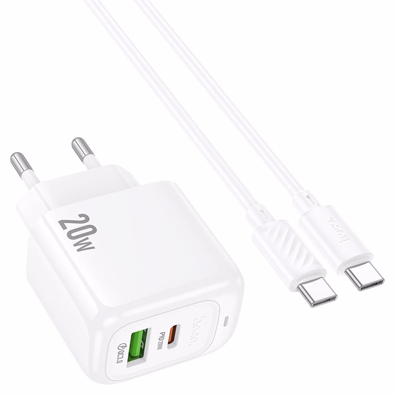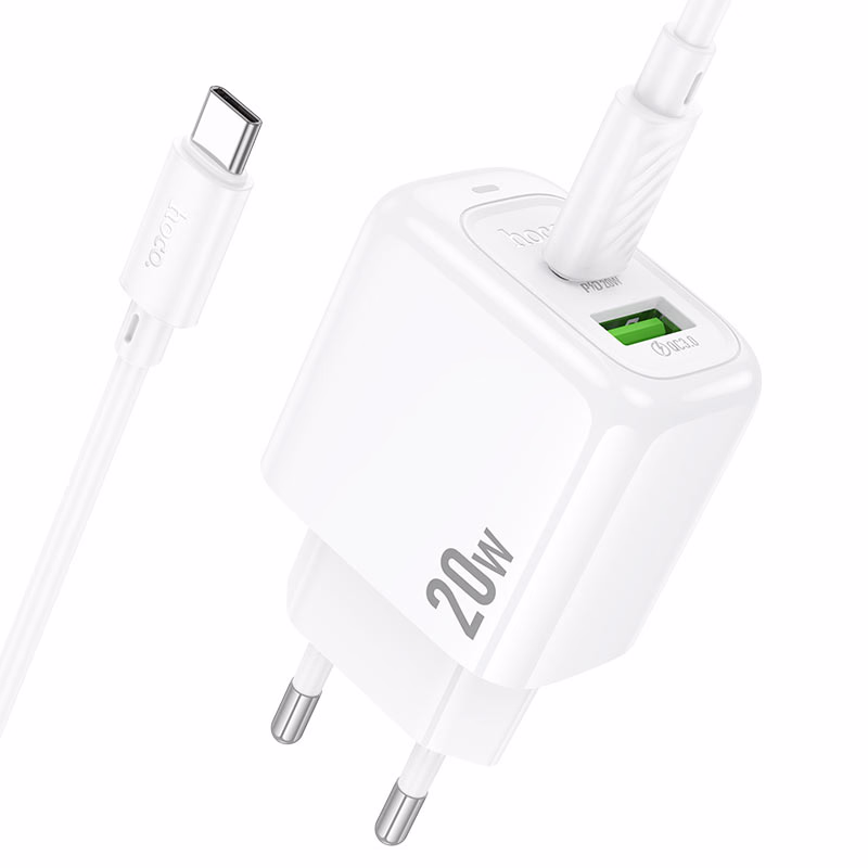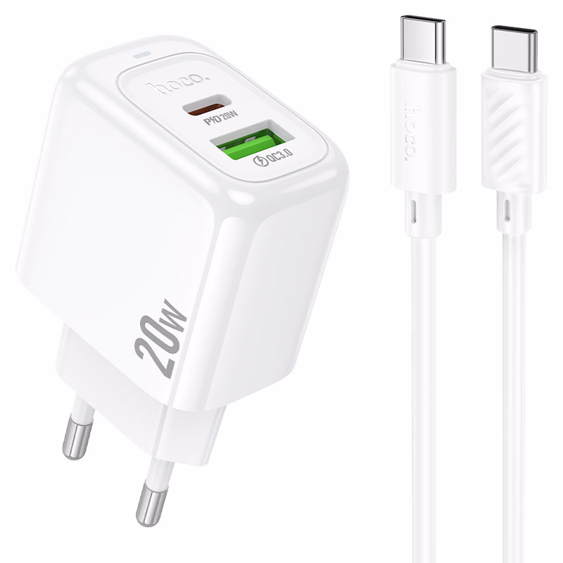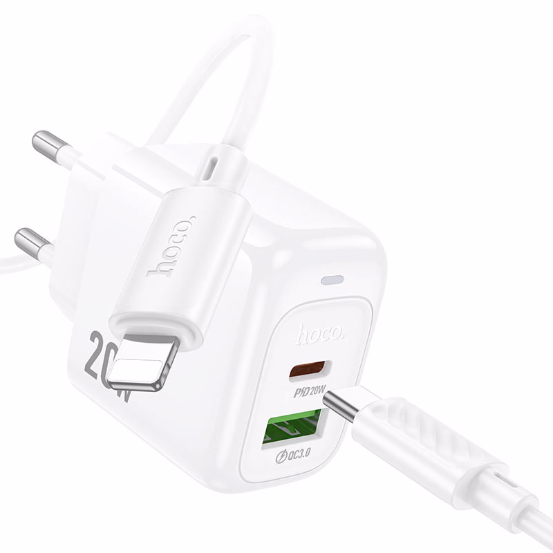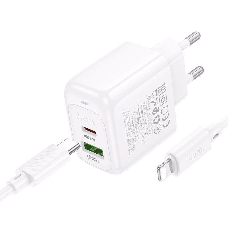 HOCO CS54A – chargeur rapide surplus duel port PD 20W+QC3.0 (C to IP)/ (c to c)- version europeene white
