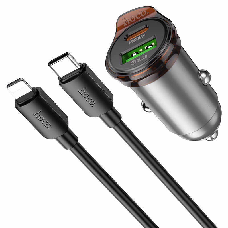 HOCO NZ16A Rigorous – Chargeur de voiture double port 43W PD25W + QC3.0 avec câble (C to IP) – Deux ports, une puissance exceptionnelle