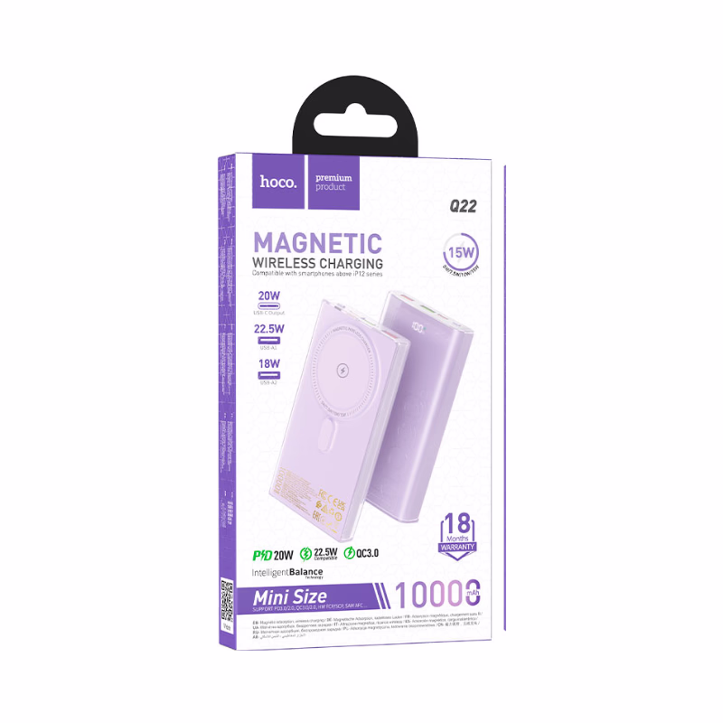 HOCO Q22 – Batterie externe magnétique Taurus 22,5 W + PD20 W (10 000 mAh) violet – , entièrement compatible, avec affichage numérique