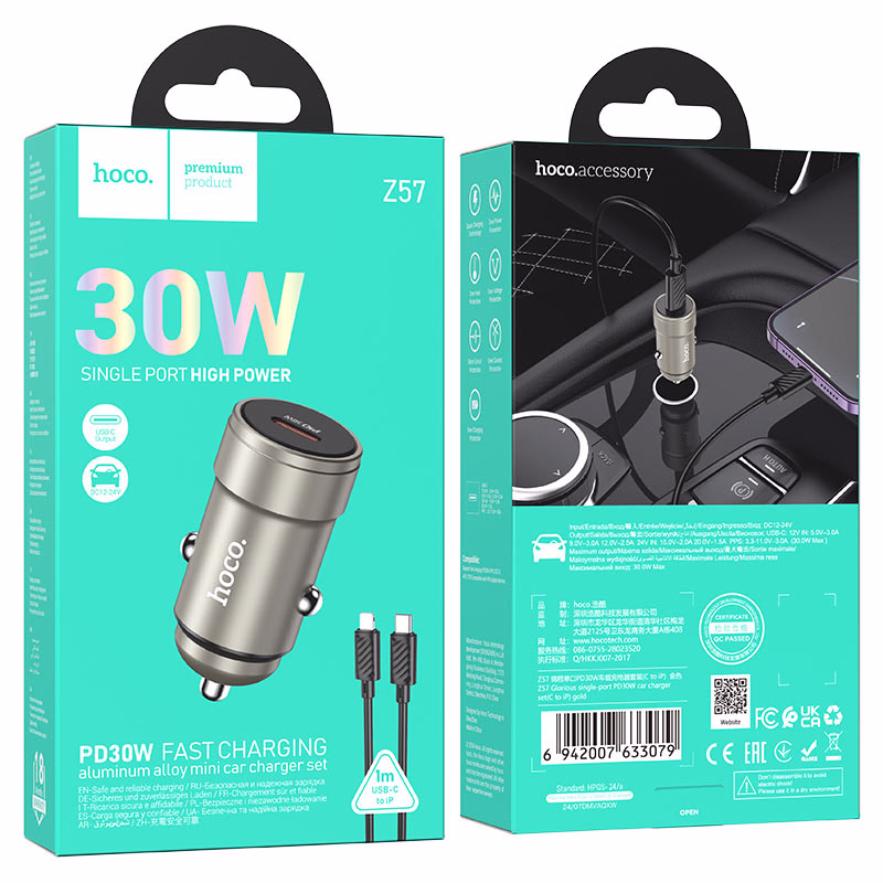 Le Z57 Glorious single-port délivre jusqu’à 30 W de puissance et s’adapte intelligemment à la tension de votre véhicule (12 V ou 24 V), assurant une charge stable et sûre grâce aux protocoles PD30W, PPS, QC3.0, AFC, FCP et plus encore. Son alliage d’aluminium offre une dissipation thermique efficace, garantissant longévité et sécurité. Compact (48,3 × 24,7 mm) et ultraléger (17 g), il se fond parfaitement dans le design intérieur de votre voiture. Le câble inclus (USB-C vers iPhone, 1 m) permet une utilisation immédiate sans accessoires supplémentaires. Le Z57 Glorious n’est pas seulement un chargeur : c’est un symbole de fiabilité et de durabilité, conçu pour accompagner les trajets les plus longs comme les plus courts, tout en préservant l’esthétique de votre espace automobile.